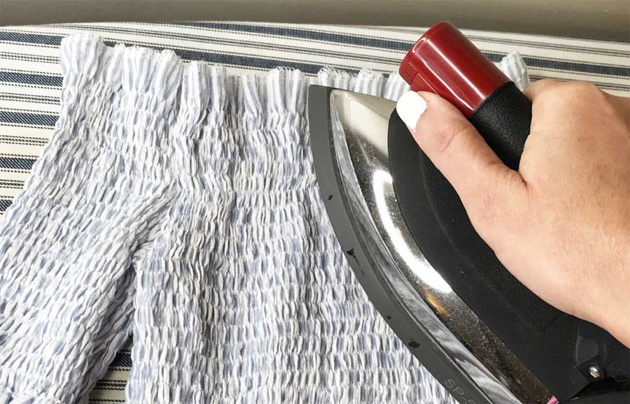 To set the fullness, lightly steam-press the shirred area. Simply hover the iron over the stitched area—do not put the iron on the fullness folds.