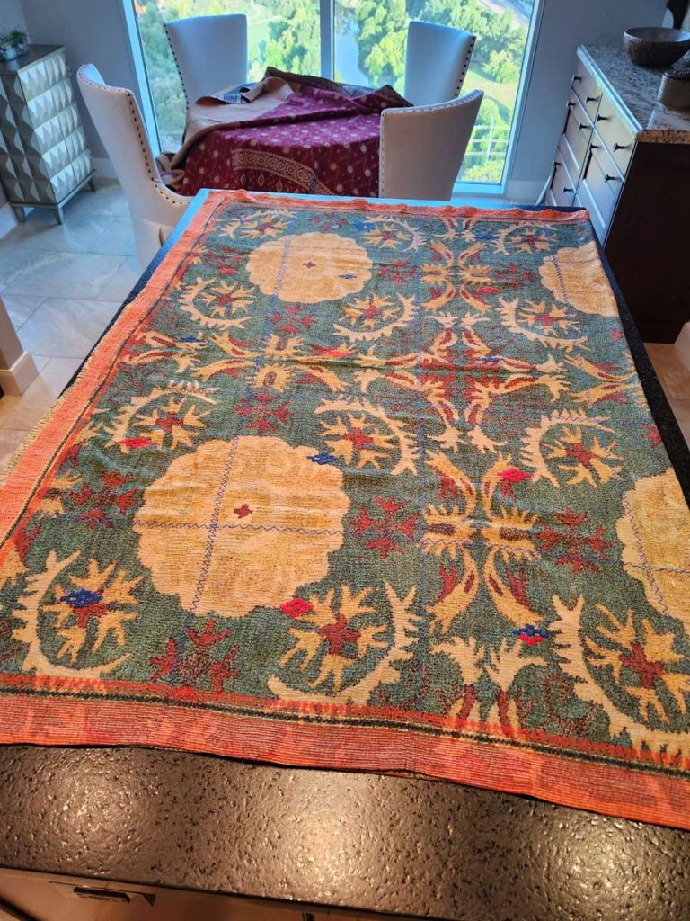 A few months later, the Marcy Tilton website offered several vintage kantha throws. I fell in love with one that had a border on all four edges and a beautiful color scheme. I ordered another kantha throw.