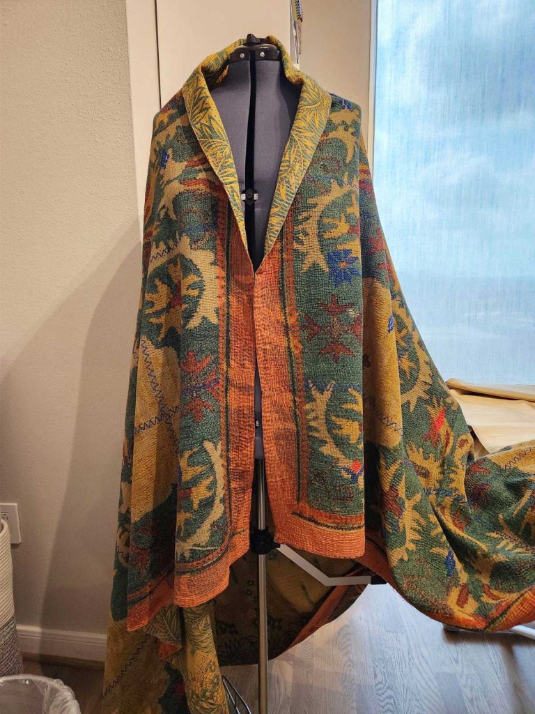 During a stroll through a Houston Heights antique mall a couple of years ago, I found a stack of kantha throws. “Get one,” my husband said. Don often aids and abets my sewing addiction. We selected a throw made of colorful silk fabrics. I took it home and draped it over a bench in my living room. It looked lovely there. Occasionally, I spread it out and tried to decide how I could cut the fabrics to create a pleasing arrangement for a jacket.