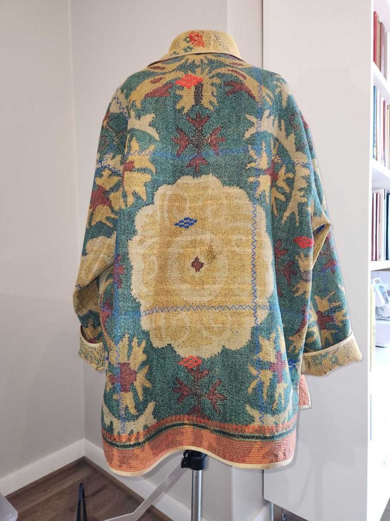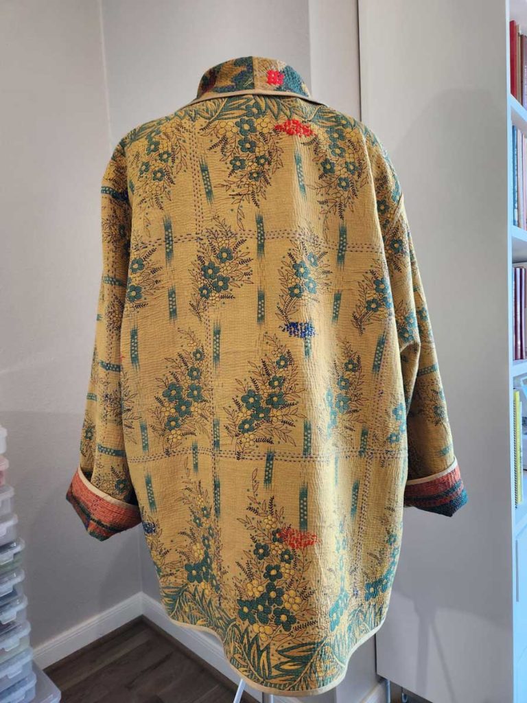 A vintage kantha throw might be dirty. Mine had a strong smell. It also had some worn spots, and I wondered whether to wash it myself or take it to the dry cleaner. My throw was made of cotton, and I guessed it had likely been washed many times. I decided to sew the jacket first. I hand-washed a scrap and saw that the water seemed very dirty. I decided to wash it on the delicate cycle with a gentle detergent in my washing machine. Then I air-dried it. A few spots showed slight fraying. I did some hand stitches to reinforce those areas, and I think my stitches blend in well with the original stitching.
