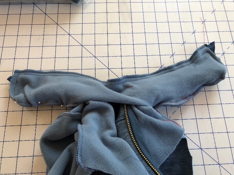 - Pin the seam allowance of upper collar to jacket edge to under collar serged edge. Repeat this on the other side.